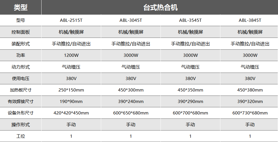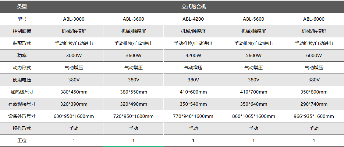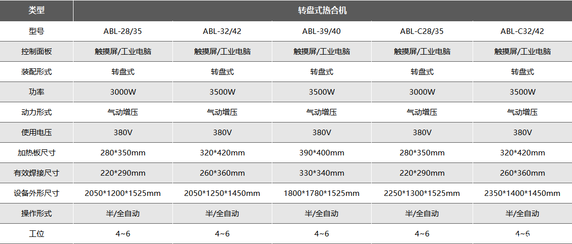 工位:立式热合机及台式热合机均为单工位,转盘式工位数量根据产品大小、客户需求进行选择,一般为4~6工位,其中ABL-C28/35、ABL-C32/42带有单独的冷却定型工位,成品封口更加美观。